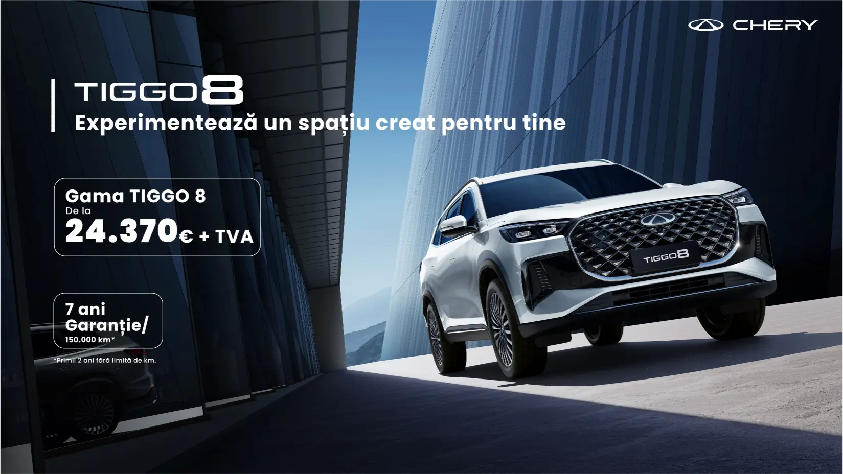 Ofertă pentru TIGGO 8, 1.6 TGDI 7DCT 147 CP, versiune Luxury, pentru persoane juridice. Ofertă pentru persoane fizice: 29.488 euro (TVA inclus), respectiv 149.504 lei (TVA inclus). Valoarea în lei este calculată la un curs estimativ de 1 euro = 5,07 lei și poate varia în funcție de cursul valutar din data achiziției.